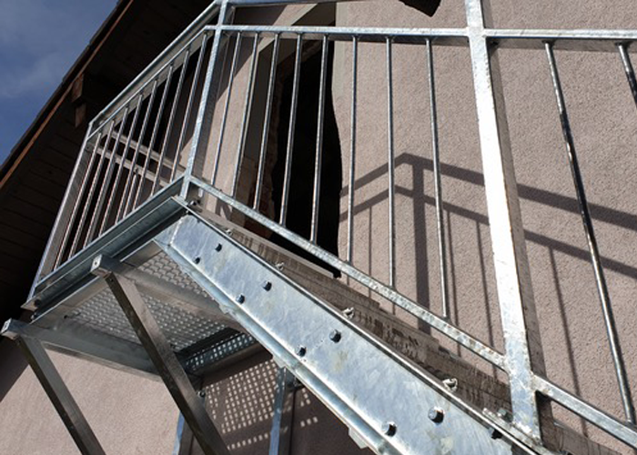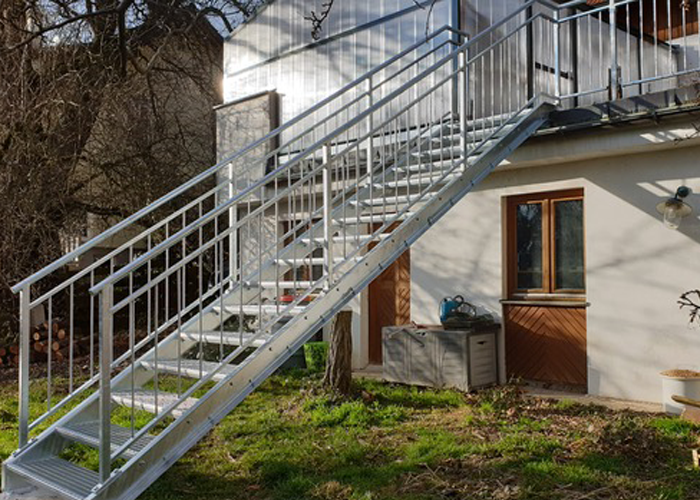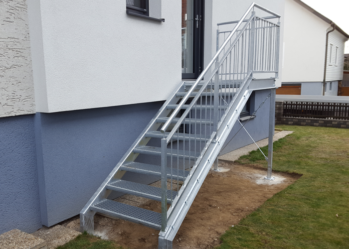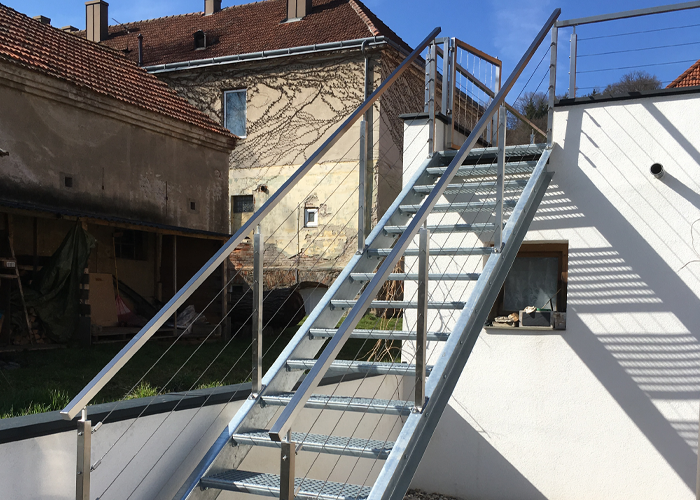 Unsere Außentreppen sind aus witterungsbeständigem, verzinktem Stahl, je nach Wunsch mit oder ohne Pulverbeschichtung in allen RAL-Farben. Ebenso setzen wir auch Geländer aus Edelstahl um. Während die Steher und Handläufe aus Flachstahl, Rund- oder Formrohr gefertigt sind, haben Sie bei der Geländerfüllung die Wahl zwischen Rundstäben, Flacheisen und Lochblech sowie Glas.